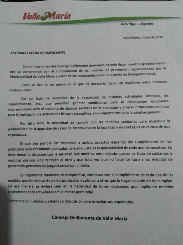 “El concejo deliberante esta en sesión permanente, también tenemos un grupo de whatsapp aparte de las reuniones virtuales que tenemos a través de algunas plataformas surgió la idea de poder acompañar a los comerciantes, buscar la manera de llegar a ellos, y en consenso se armó esta nota en la cual se agradece al comerciante de Valle María por el compromiso con el cumplimiento de las medidas de prevención que fueron reglamentadas por el municipio, también se les comentó a la gente que estamos trabajando, refrendando las medidas y los decretos del ejecutivo municipal, que está trabajando el Comité de Emergencia, el cual tiene a los concejales que lo integran, está Luciano Acevedo y Pamela Rohr, entonces comunicarles para que estén al tanto los vecinos, nos repartimos entre los 7 concejales y el vice intendente Hereñú, nos repartimos diferentes zonas de Valle María para tratar de llegar a todos los comercios con esta nota, también alentarlos a que sigan cumpliendo las medidas para poder continuar con esto, aunque en Valle María no hay casos y que esto pueda seguir así, y no que ocurran cosas que luego vayan a hacer que tengamos que retroceder en las medidas que se tomaron” manifestó Unrein a este medio.