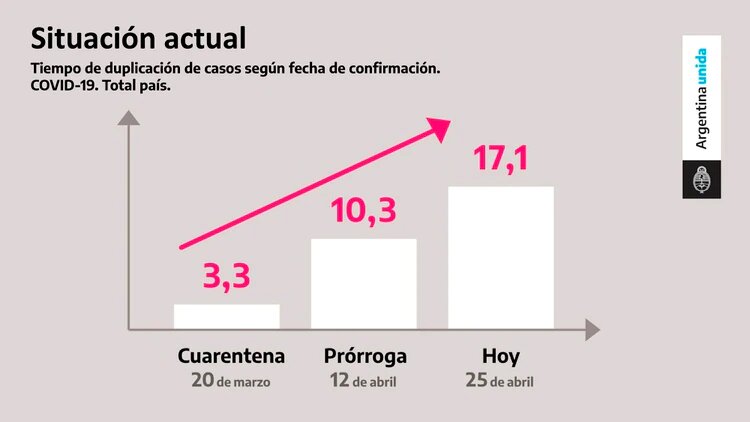 La decisión del jefe de Estado se apoyó en un dato clave sobre la tasa de contagio del COVID19 en la Argentina. Si el número de contagiados se duplicaba después de 25 días, Alberto Fernández ordenaba pasar a la fase IV de la estrategia contra la pandemia, que implicaba abrir ciertas actividades comerciales e industriales en todo el país.