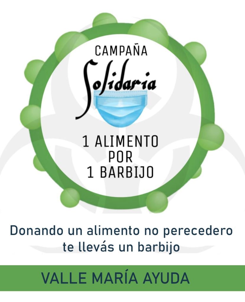 Esta semana, la campaña de donación de alimentos secos destinados a comedores comunitarios del departamento Diamante llegará a Valle María. Del miércoles al sábado, en diferentes horarios tanto de mañana como de tarde, voluntarios estarán frente a los comercios cambiando un barbijo por un alimento no perecedero.