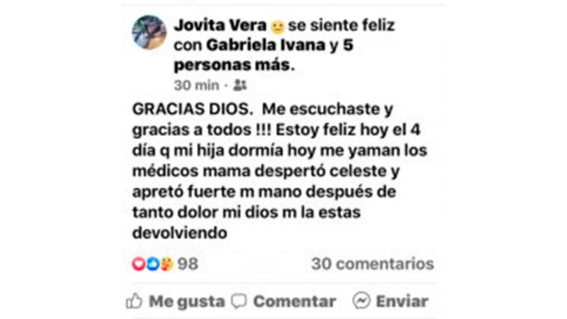 La madre publicó esta gran noticia en la red social Facebook, expresando «Dios es grande! Dios es fiel», Celeste despertó.