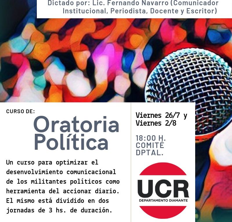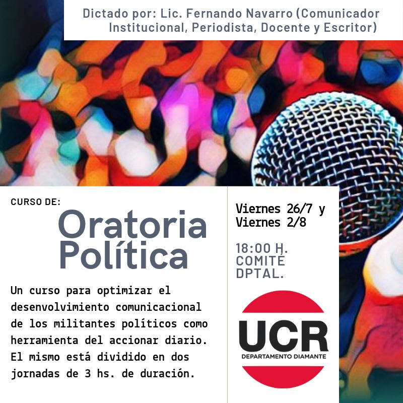 Los encuentros son de carácter libre y gratuito, para militantes, simpatizantes y público interesado. «El curso será dictado por el Lic. Fernando Navarro (Comunicador institucional, periodista, docente y escritor) y está compuesto por dos jornadas de tres horas de duración cada una, las mismas serán los días viernes 26 de Julio y viernes 2 de Agosto a las 18:00 hs. en el Comité Departamental de la UCR ubicado en calle Urquiza 517, ciudad de Diamante» mencionó Monge a Periódico Informe 3.