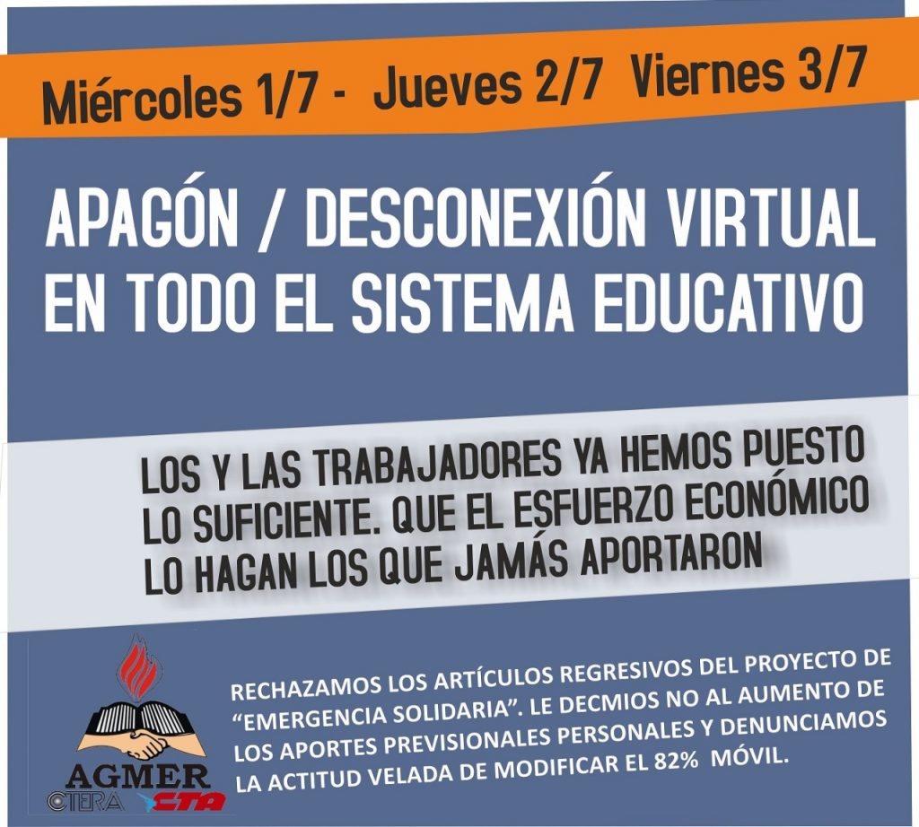 Los maestros estatales nucleados en AGMER realizarán un apagón virtual -que consiste en la interrupción del dictado de clases vía internet o cualquier otra metodología- los días miércoles, jueves y viernes de esta semana.