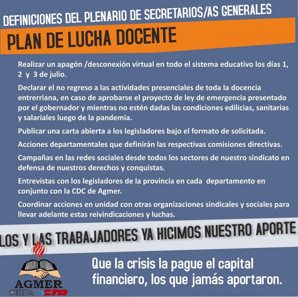El plenario de secretarios generales de la Asociación Gremial del Magisterio de Entre Ríos (AGMER), que sesionó este lunes en forma virtual, manifestó “su total y absoluto rechazo” al proyecto de Ley de Emergencia Solidaria anunciado por el gobernador Gustavo Bordet el viernes, al que calificó de “regresivo y confiscatorio”.