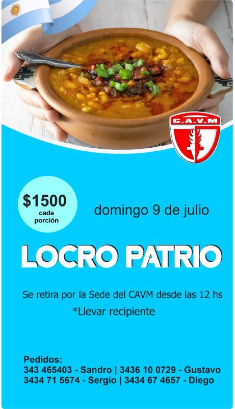 El Club Atlético Valle María organiza un locro patrio Publicada el 28 junio, 2023 por Informe 3 Para el próximo domingo 09 de julio, el C.A.V.M organiza la venta de locro patrio a 1500 pesos la porción. Se retira en la sede del club (Los Álamos y Los Ceibos) a partir de las 12 hs.