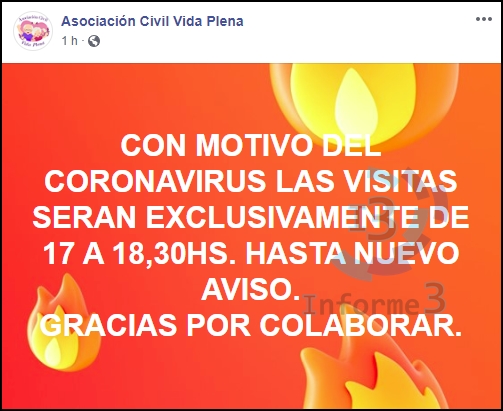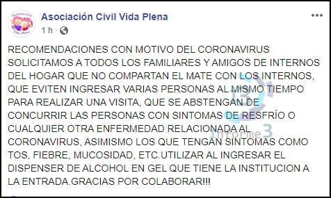 Desde la Asociación Civil Vida Plena, quien administra el hogar de ancianos «María y Enrique» dieron a conocer sobre los recaudos para evitar transmisión del coronavirus. El horario de visitas sera exclusivamente de 17 a 18:30 horas y solicita a familiares y amigos que no compartan mate con los internos como así también evitar visitas que tengan síntomas de resfrío, tos, fiebre o mucosidad.