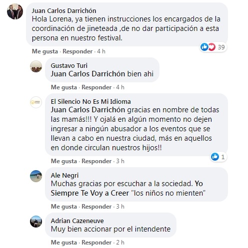 Lorena Sian quien es la cara visible de esta ONG expresó también sobre la decisión del intendente Juan Carlos Darrichón, «hoy 5 de Enero de 2022 me siento más acompañada desde la decisión del Sr Intendente de nuestra ciudad, es una caricia al alma y sin lugar a dudas es un comienzo de ser escuchadas con nuestra lucha, esa lucha que llevamos años siendo calladas y que ahora con esto se muestra de que podemos llegar a creer en alguien, Gracias Juan Carlos porque esto nos emociona, sin que nos politizen nuestra lucha ojala todos los que estén acusado de este flagelo como es el abuso de un niño no puedan acceder a ningun evento».