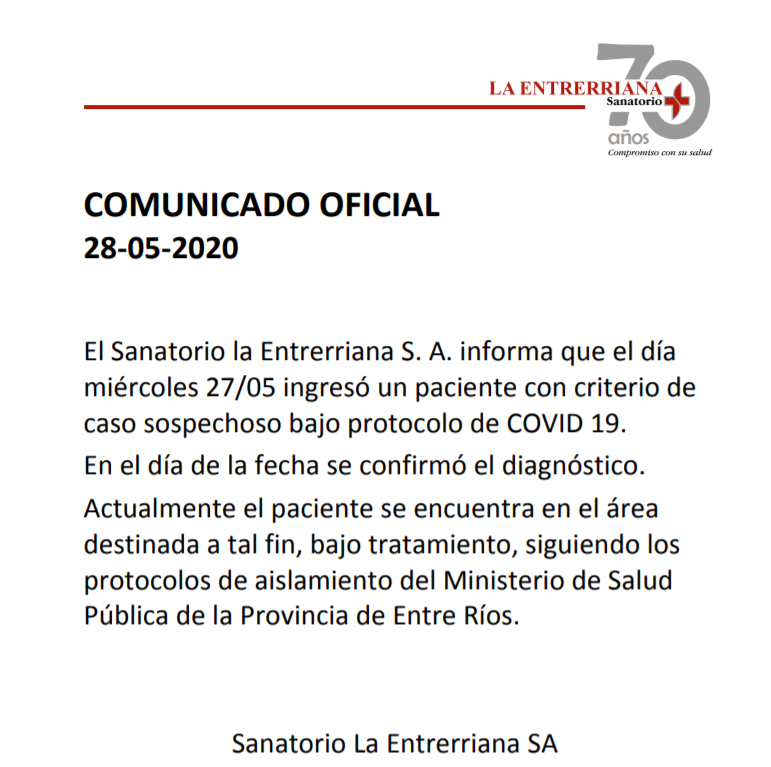 «El miércoles 27/05 ingresó un paciente con criterio de caso sospechoso bajo protocolo de COVID 19», detallan en un comunicado. «En el día de la fecha se confirmó el diagnóstico. Actualmente el paciente se encuentra en el área