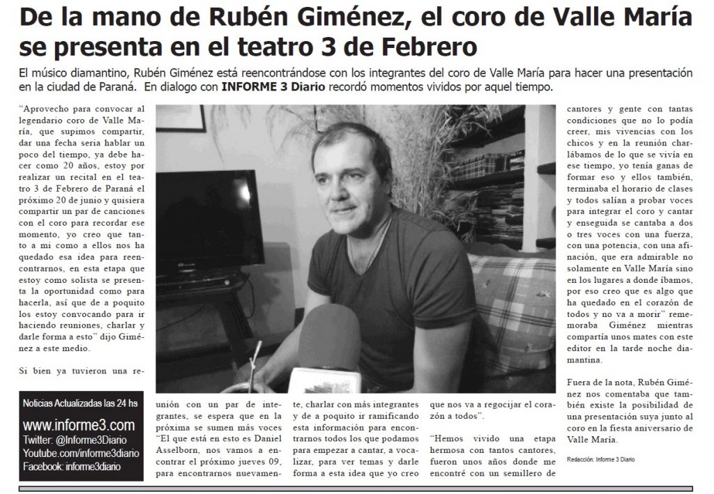 El 18 de julio de 2015 en el marco de los festejos de los 137 años de la fundación de Valle María, integrantes ex del coro de niños y jóvenes de Valle María subian al escenario para compartir el escenario con el músico diamantino Rubén Giménez. El mes anterior se habían presentado en el teatro 3 de Febrero de la ciudad de Paraná. En Valle María, pudieron cantar acompañados de su hijos e hijas. Este viernes 24 de julio, Informe 3 TV emitirá la presentación realizada en Valle María.
