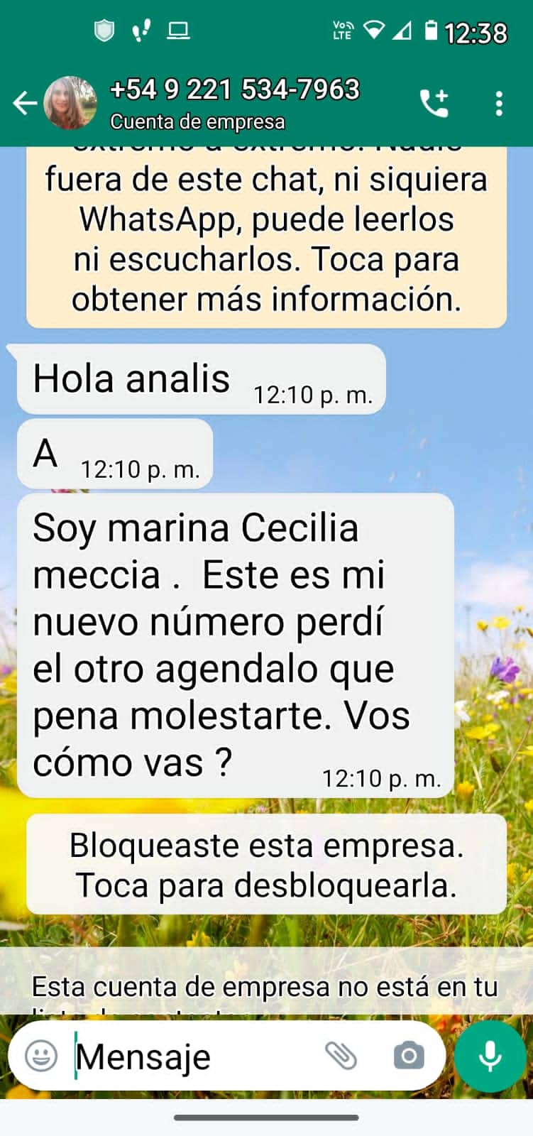 El hecho se dio a conocer en las ultimas horas cuando Marina Meccia, ex presidenta de Junta de Gobierno de Alvear recibió un mensaje de una conocida donde le alertaban que circulaba un numero de teléfono haciéndose pasar por ella. Este número, que tiene característica de la provincia de Buenos Aires, envía mensajes a través de la aplicación de WhatsApp informando que es el nuevo numero de Meccia y ofreciendo dólares que se deben pagar mediante transferencia bancaria.