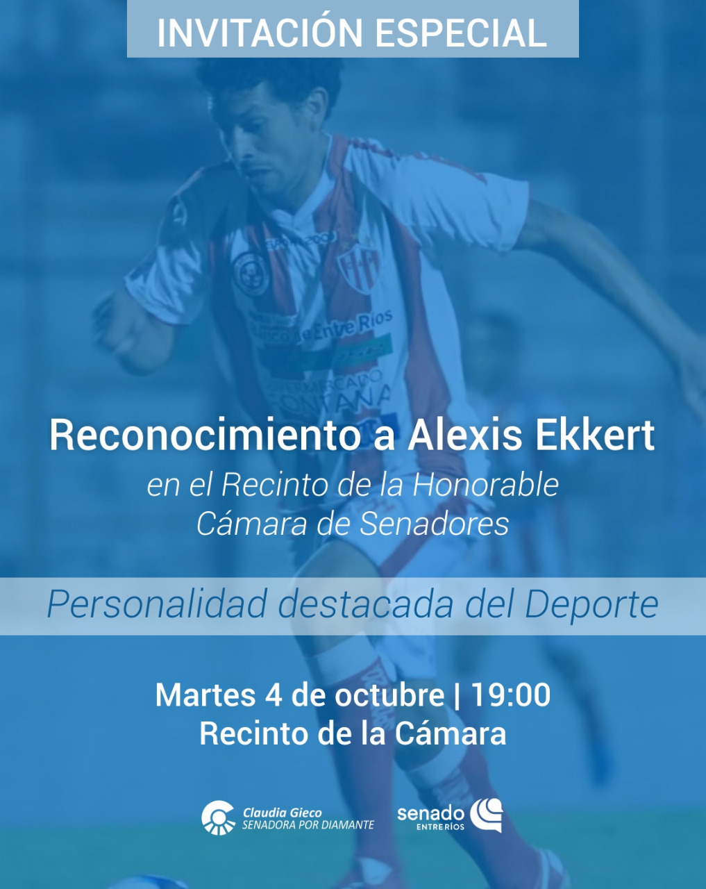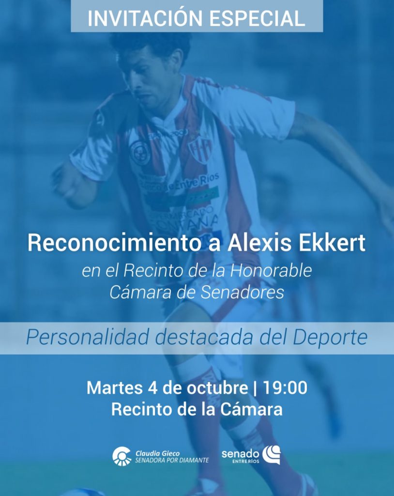 Mediante una iniciativa de la senadora Claudia Gieco, el futbolista del Club Atlético Paraná, Alexis Ekkert, recibirá un reconocimiento como «Personalidad destacada del deporte» por su trayectoria.