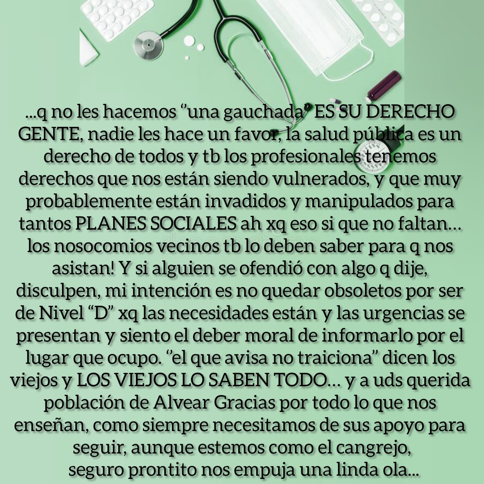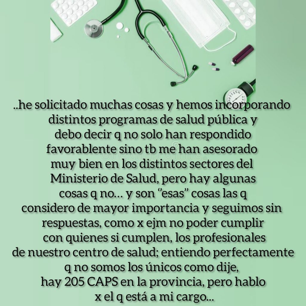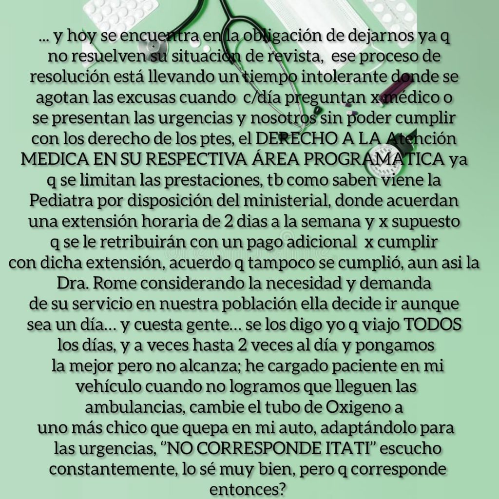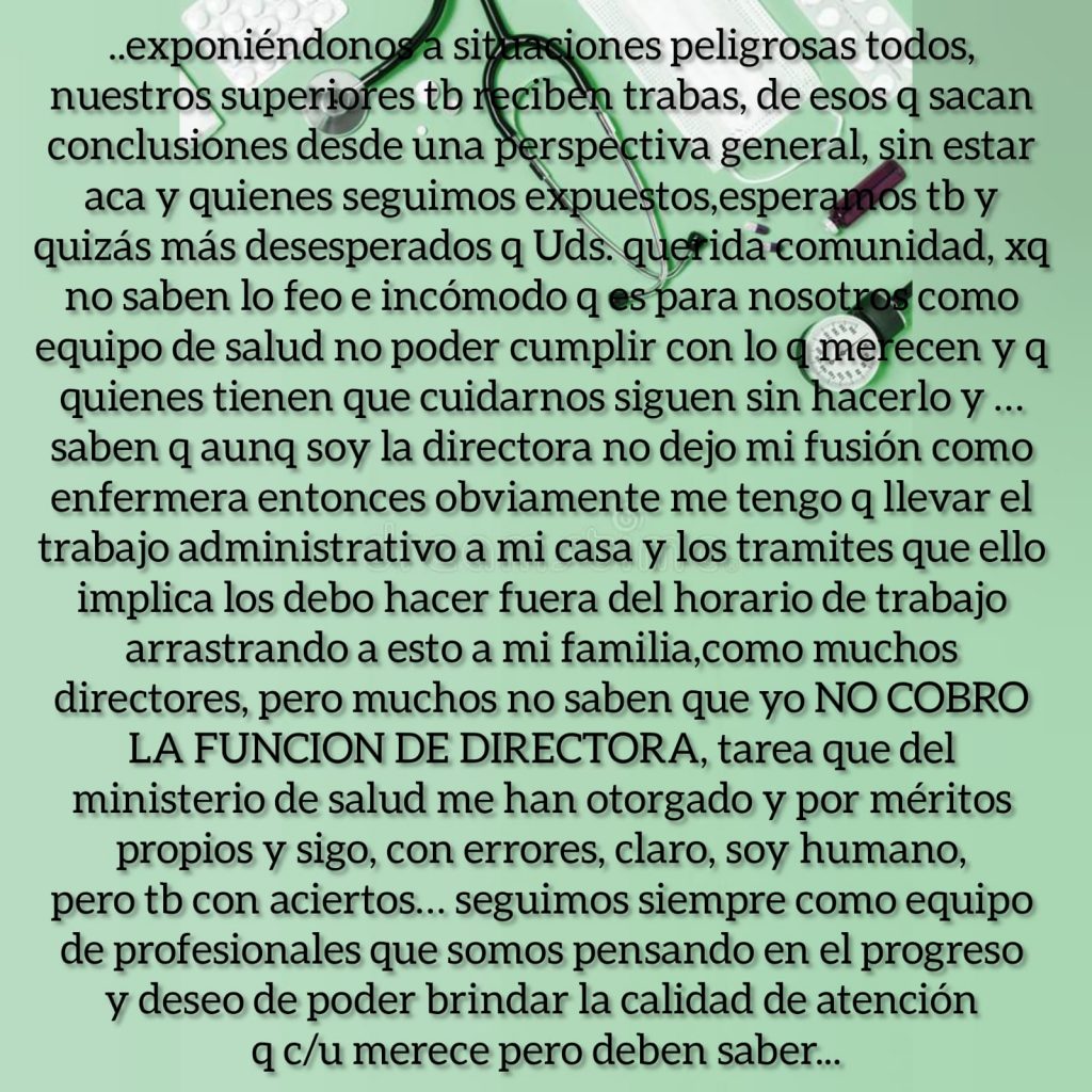 Quien les habla, Lic. Unrein Itatí, Enfermera y Directora por Resolución Nro. 4876 MS del Centro de Salud de Alvear, considero que ustedes más que nadie deben saber en la situación que nos encontramos hoy porque también les afecta, siempre apunto al equipo que el 1er objetivo luego del de cuidarnos a nosotros mismos es ‘escuchar’’ y es así como hemos crecido, priorizando y gestionando las necesidades nuestros pacientes y entendiendo que nuestros tiempos no son los mismos que los de nuestros superiores y que todos ponen los mejor de sí para cumplir con c/u de los pedidos de los 205 Centro de Salud de la provincia, he solicitado muchas cosas y hemos incorporando distintos programas de salud pública y debo decir que no solo han respondido favorablente sino también me han asesorado muy bien en los distintos sectores del Ministerio de Salud, pero hay algunas cosas que no… y son ‘’esas’’ cosas las que considero de mayor importancia y seguimos sin respuestas, como por ejemplo no poder cumplir con quienes si cumplen, los profesionales de nuestro centro de salud; entiendo perfectamente que no somos los únicos como dije, hay 205 CAPS en la provincia, pero hablo por el que está a mi cargo y también entiendo que no depende solo nuestra Directora de APS de la provincia ya que ella también debe responder y cumplir ciertas ‘’normativas’’ de hecho fue ella quien me dio una solución cuando a último momento ya nos quedábamos sin medico clínico, así y todo es complejo ya que de tener 2 veces a la semana atención medica para adultos, vamos a tener 1, hasta resolver la situación de nuestra compañera me dicen y confío en ello… La Dra. Segui cumplía esa función hasta el momento desde hace 3 años brindando su atención medica en Alvear pero para salud pública no existe en nuestro staff, sin embargo todo este tiempo ha atendido, hemos corrido en urgencias, ha brindado talleres, hemos realizado tareas extramuros, ha dejado su firma y sello en documentos legales pertenecientes a este Centro de salud, pero ‘’no existe’’ y hoy se encuentra en la obligación de dejarnos ya que no resuelven su situación de revista, ese proceso de resolución está llevando un tiempo intolerante donde se agotan las excusas cuando c/día preguntan por médico o se presentan las urgencias y nosotros sin poder cumplir con los derecho de los pacientes, el DERECHO A LA Atención MEDICA EN SU RESPECTIVA ÁREA PROGRAMATICA ya q se limitan las prestaciones, también como saben viene la Pediatra por disposición del ministerial, donde acuerdan una extensión horaria de 2 días a la semana y por supuesto que se le retribuirán con un pago adicional por cumplir con dicha extensión, acuerdo que tampoco se cumplió, aun así la Dra. Rome considerando la necesidad y demanda de su servicio en nuestra población ella decide ir aunque sea un día… y cuesta gente… se los digo yo que viajo TODOS los días, y a veces hasta 2 veces al día y pongamos la mejor pero no alcanza; he cargado paciente en mi vehículo cuando no logramos que lleguen las ambulancias, cambie el tubo de Oxigeno a uno más chico que quepa en mi auto, adaptándolo para las urgencias, ‘’NO CORRESPONDE ITATI’’ escucho constantemente, lo sé muy bien, pero que corresponde entonces? Cuándo llaman por urgencias, cumplimos con el triage y los acompañamos en la agonía hasta…solo Dios sabe?? imposible! Gestionamos una unidad de traslado o ambulancia, pero me dicen que no se justifica por las pocas situaciones de emergencias que se nos presentan, se que implicaría muchos gastos que no tenemos y la junta de Gobierno del pueblo tampoco, eso me dice, porque no es la Unidad y ya, es mantenerla en condiciones q los 9km de broza hasta la ruta expone a los vehículos a lo peor, el combustible, el chofer, QUIEN SUBE en los traslados, porque tenemos esa situación delicada también que he solicitado otro enfermero profesional ya que la población crece y por ende las exigencias sobre sus derechos y nuestra compañera que es auxiliar de enfermería cumple su función en un turno solita y pone lo que está a su alcance pero está limitada por su formación con las prestaciones que puede realizar, por lo tanto me sobrecargo con esas tareas o el paciente se va a otro lugar, y a esto me dicen q no es posible otro enfermero porque NO HAY CARGOS y entonces la pasa mal mi compañera, yo, el paciente y su familiar y seguimos poniendo lo mejor de c/u para los paciente claro, exponiéndonos a situaciones peligrosas todos, nuestros superiores también reciben trabas, de esos que sacan conclusiones desde una perspectiva general, sin estar acá y quienes seguimos expuestos, esperamos también y quizás más desesperados q Uds. querida comunidad, porque no saben lo feo e incómodo que es para nosotros como equipo de salud no poder cumplir con lo q merecen y que quienes tienen que cuidarnos siguen sin hacerlo y … saben que aunque soy la directora no dejo mi fusión como enfermera entonces obviamente me tengo q llevar el trabajo administrativo a mi casa y los tramites que ello implica los debo hacer fuera del horario de trabajo arrastrando a esto a mi familia, como muchos directores, pero muchos no saben que yo NO COBRO LA FUNCION DE DIRECTORA, tarea que del ministerio de salud me han otorgado y por méritos propios y sigo, con errores, claro, soy humano, pero tambien con aciertos… seguimos siempre como equipo de profesionales que somos pensando en el progreso y deseo de poder brindar la calidad de atención que c/u merece pero deben saber que no les hacemos ‘’una gauchada’’ ES SU DERECHO GENTE, nadie les hace un favor, la salud pública es un derecho de todos y también los profesionales tenemos derechos que nos están siendo vulnerados, y que muy probablemente están invadidos y manipulados para tantos PLANES SOCIALES ah porque eso sí que no faltan… los nosocomios vecinos también lo deben saber para q nos asistan! Y si algu