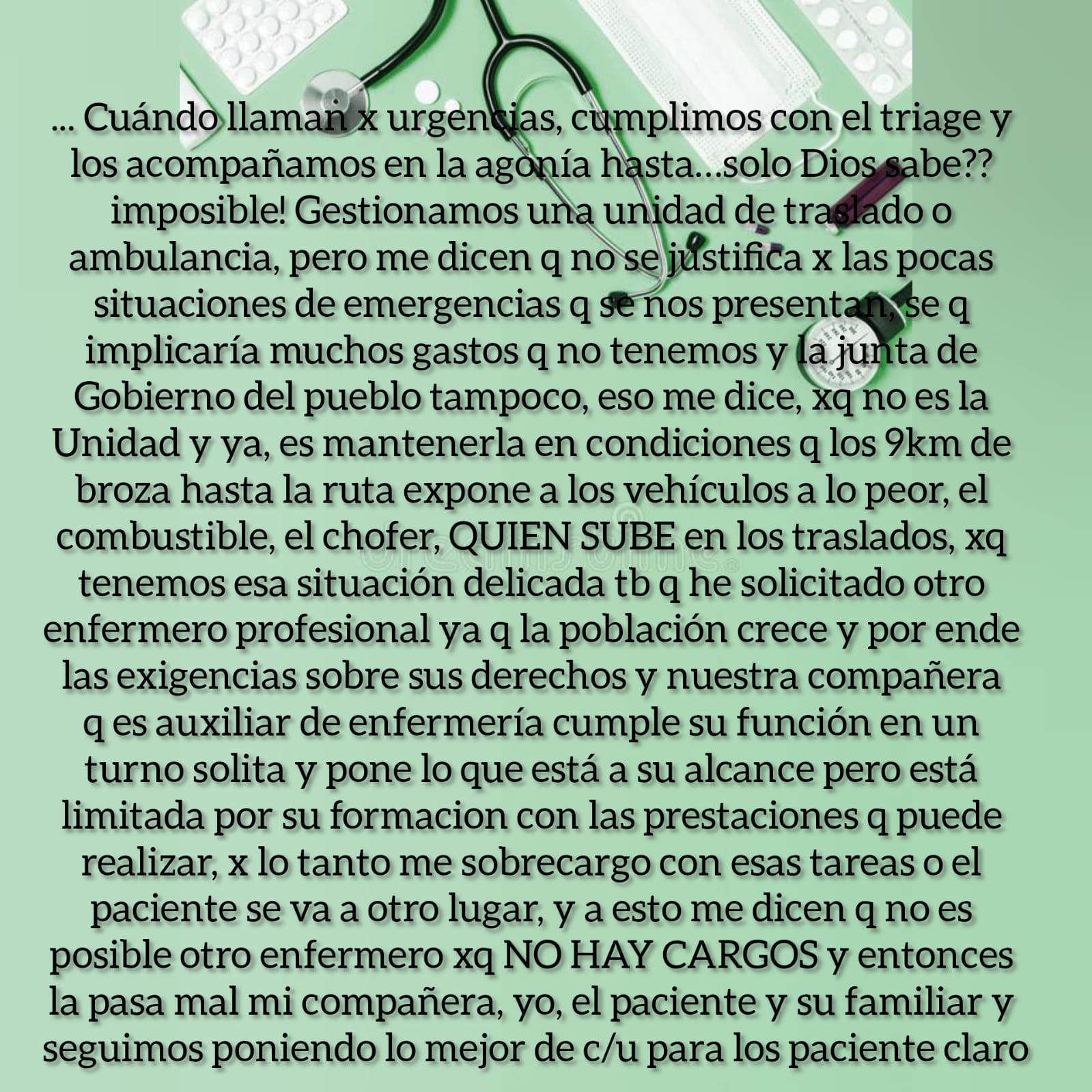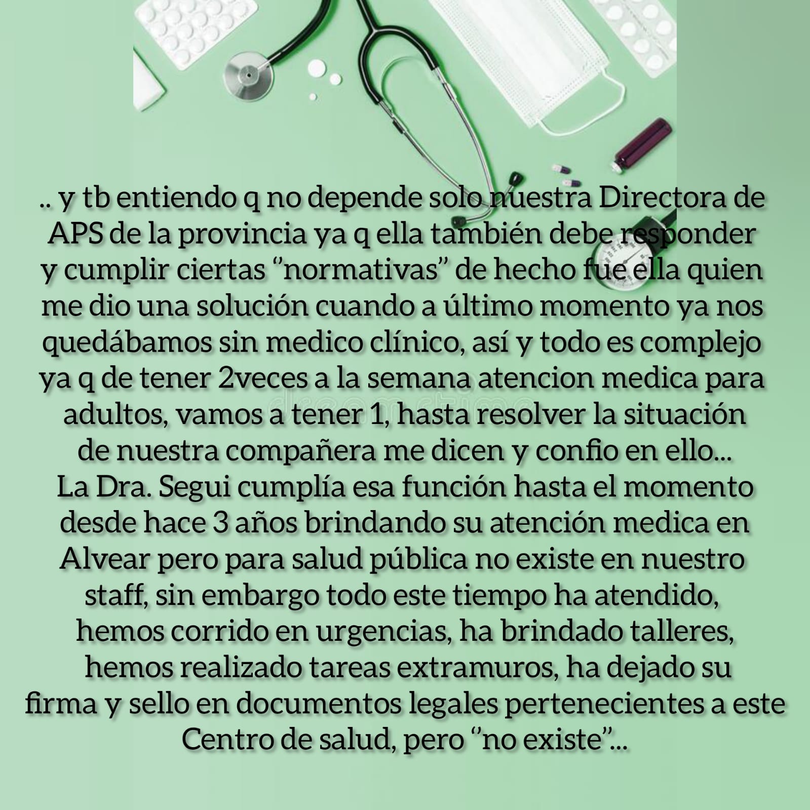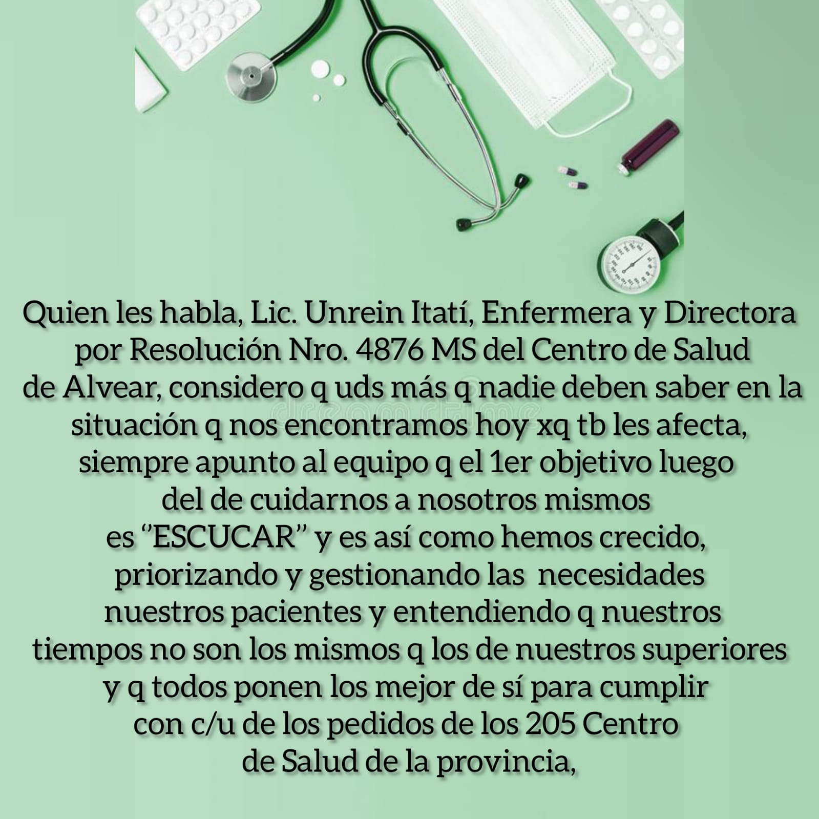 Quien les habla, Lic. Unrein Itatí, Enfermera y Directora por Resolución Nro. 4876 MS del Centro de Salud de Alvear, considero que ustedes más que nadie deben saber en la situación que nos encontramos hoy porque también les afecta, siempre apunto al equipo que el 1er objetivo luego del de cuidarnos a nosotros mismos es ‘escuchar’’ y es así como hemos crecido, priorizando y gestionando las necesidades nuestros pacientes y entendiendo que nuestros tiempos no son los mismos que los de nuestros superiores y que todos ponen los mejor de sí para cumplir con c/u de los pedidos de los 205 Centro de Salud de la provincia, he solicitado muchas cosas y hemos incorporando distintos programas de salud pública y debo decir que no solo han respondido favorablente sino también me han asesorado muy bien en los distintos sectores del Ministerio de Salud, pero hay algunas cosas que no… y son ‘’esas’’ cosas las que considero de mayor importancia y seguimos sin respuestas, como por ejemplo no poder cumplir con quienes si cumplen, los profesionales de nuestro centro de salud; entiendo perfectamente que no somos los únicos como dije, hay 205 CAPS en la provincia, pero hablo por el que está a mi cargo y también entiendo que no depende solo nuestra Directora de APS de la provincia ya que ella también debe responder y cumplir ciertas ‘’normativas’’ de hecho fue ella quien me dio una solución cuando a último momento ya nos quedábamos sin medico clínico, así y todo es complejo ya que de tener 2 veces a la semana atención medica para adultos, vamos a tener 1, hasta resolver la situación de nuestra compañera me dicen y confío en ello… La Dra. Segui cumplía esa función hasta el momento desde hace 3 años brindando su atención medica en Alvear pero para salud pública no existe en nuestro staff, sin embargo todo este tiempo ha atendido, hemos corrido en urgencias, ha brindado talleres, hemos realizado tareas extramuros, ha dejado su firma y sello en documentos legales pertenecientes a este Centro de salud, pero ‘’no existe’’ y hoy se encuentra en la obligación de dejarnos ya que no resuelven su situación de revista, ese proceso de resolución está llevando un tiempo intolerante donde se agotan las excusas cuando c/día preguntan por médico o se presentan las urgencias y nosotros sin poder cumplir con los derecho de los pacientes, el DERECHO A LA Atención MEDICA EN SU RESPECTIVA ÁREA PROGRAMATICA ya q se limitan las prestaciones, también como saben viene la Pediatra por disposición del ministerial, donde acuerdan una extensión horaria de 2 días a la semana y por supuesto que se le retribuirán con un pago adicional por cumplir con dicha extensión, acuerdo que tampoco se cumplió, aun así la Dra. Rome considerando la necesidad y demanda de su servicio en nuestra población ella decide ir aunque sea un día… y cuesta gente… se los digo yo que viajo TODOS los días, y a veces hasta 2 veces al día y pongamos la mejor pero no alcanza; he cargado paciente en mi vehículo cuando no logramos que lleguen las ambulancias, cambie el tubo de Oxigeno a uno más chico que quepa en mi auto, adaptándolo para las urgencias, ‘’NO CORRESPONDE ITATI’’ escucho constantemente, lo sé muy bien, pero que corresponde entonces? Cuándo llaman por urgencias, cumplimos con el triage y los acompañamos en la agonía hasta…solo Dios sabe?? imposible! Gestionamos una unidad de traslado o ambulancia, pero me dicen que no se justifica por las pocas situaciones de emergencias que se nos presentan, se que implicaría muchos gastos que no tenemos y la junta de Gobierno del pueblo tampoco, eso me dice, porque no es la Unidad y ya, es mantenerla en condiciones q los 9km de broza hasta la ruta expone a los vehículos a lo peor, el combustible, el chofer, QUIEN SUBE en los traslados, porque tenemos esa situación delicada también que he solicitado otro enfermero profesional ya que la población crece y por ende las exigencias sobre sus derechos y nuestra compañera que es auxiliar de enfermería cumple su función en un turno solita y pone lo que está a su alcance pero está limitada por su formación con las prestaciones que puede realizar, por lo tanto me sobrecargo con esas tareas o el paciente se va a otro lugar, y a esto me dicen q no es posible otro enfermero porque NO HAY CARGOS y entonces la pasa mal mi compañera, yo, el paciente y su familiar y seguimos poniendo lo mejor de c/u para los paciente claro, exponiéndonos a situaciones peligrosas todos, nuestros superiores también reciben trabas, de esos que sacan conclusiones desde una perspectiva general, sin estar acá y quienes seguimos expuestos, esperamos también y quizás más desesperados q Uds. querida comunidad, porque no saben lo feo e incómodo que es para nosotros como equipo de salud no poder cumplir con lo q merecen y que quienes tienen que cuidarnos siguen sin hacerlo y … saben que aunque soy la directora no dejo mi fusión como enfermera entonces obviamente me tengo q llevar el trabajo administrativo a mi casa y los tramites que ello implica los debo hacer fuera del horario de trabajo arrastrando a esto a mi familia, como muchos directores, pero muchos no saben que yo NO COBRO LA FUNCION DE DIRECTORA, tarea que del ministerio de salud me han otorgado y por méritos propios y sigo, con errores, claro, soy humano, pero tambien con aciertos… seguimos siempre como equipo de profesionales que somos pensando en el progreso y deseo de poder brindar la calidad de atención que c/u merece pero deben saber que no les hacemos ‘’una gauchada’’ ES SU DERECHO GENTE, nadie les hace un favor, la salud pública es un derecho de todos y también los profesionales tenemos derechos que nos están siendo vulnerados, y que muy probablemente están invadidos y manipulados para tantos PLANES SOCIALES ah porque eso sí que no faltan… los nosocomios vecinos también lo deben saber para q nos asistan! Y si algu