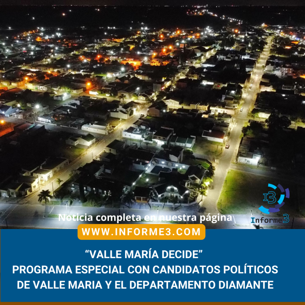 «Valle María Decide» – Programa Especial con candidatos y candidatas Publicada el 20 octubre, 2023 por Informe 3 En una produccion conjunta entre Canal 3 e Informe3.com se llevó a cabo la segunda edición de Valle María Decide. Este envío periodistico se emitió en forma simultánea a traves de canal 3 y del canal de youtube de Informe 3.